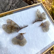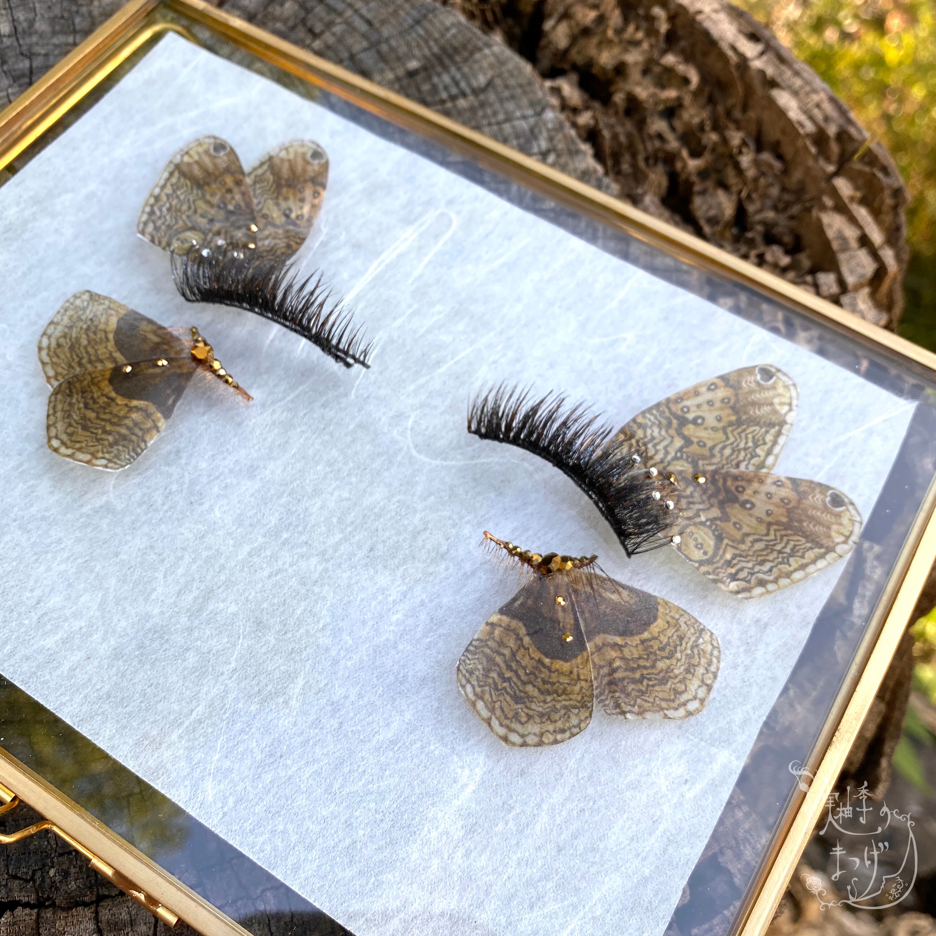 前翅には眼状紋、後ろ翅には梟の嘴を模した美しい模様のある蛾“イボタガ”のつけまつげ。